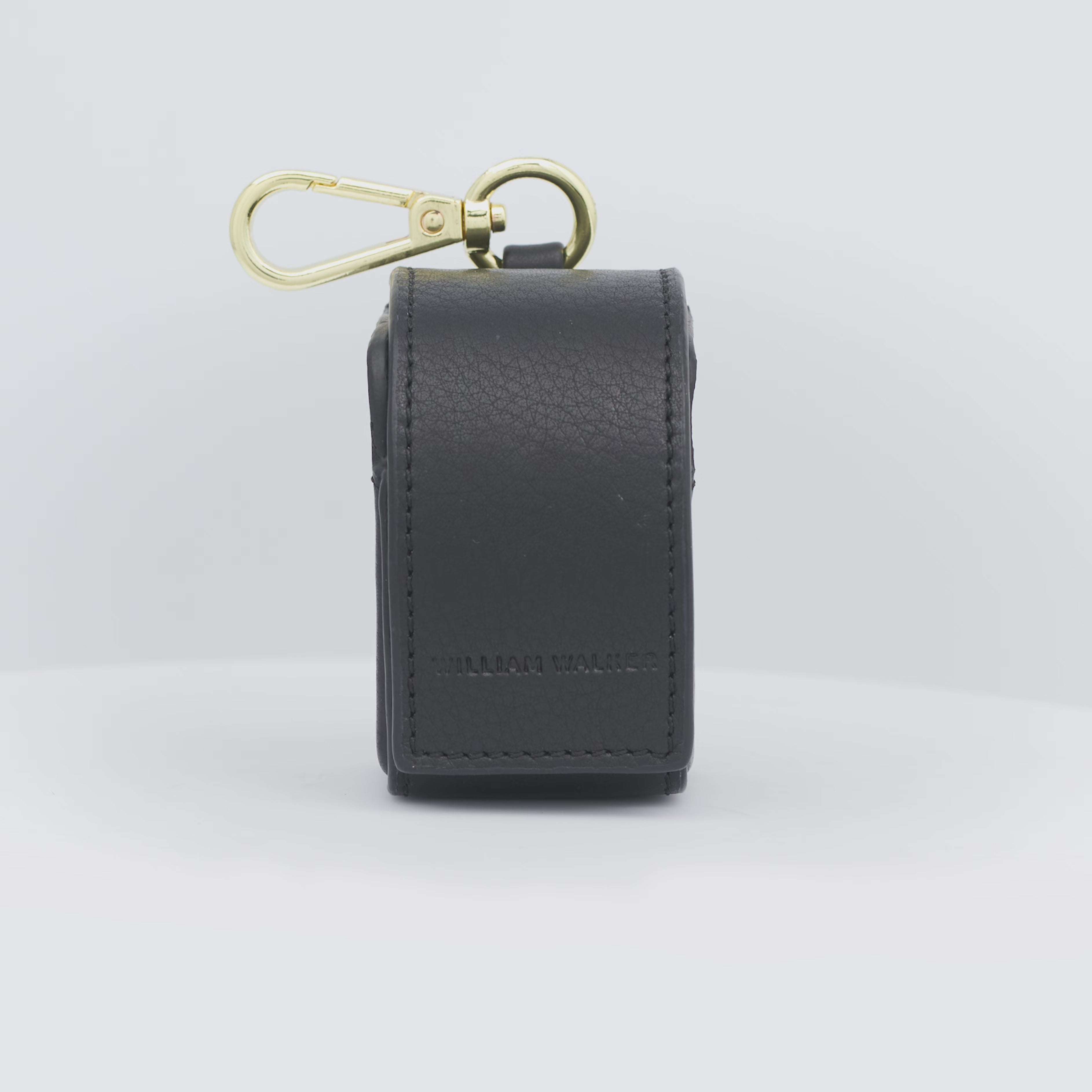 Hochwertiger Kotbeutelspender aus schwarzem Leder mit Öffnung zum Herausziehen auf der Rückseite. Einfache Anbringung dank Karabiner.