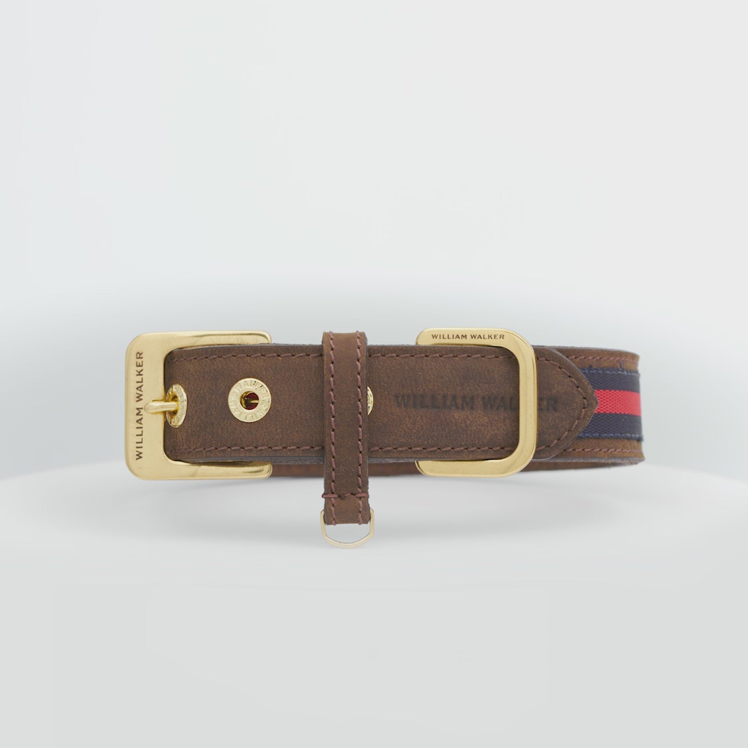 Collier en cuir de haute qualité avec des pièces en laiton et des bandes de toile décoratives rouges et bleues. Pour les grands et les petits chiens.